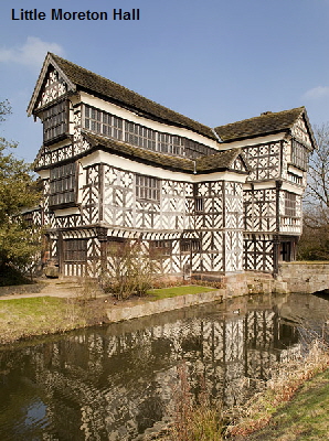 Little Moreton Hall in Cheshire is arguably our finest timber framed, moated manor house. It’s south front appears very drunk and its aesthetic appeal lies both in the variety of chequerboard patterns of black timber and white mortar and the way that the house appears to be collapsing slowly under its own weight. The lack of furnishing and decoration throughout, gives visitors an almost unique opportunity to study Tudor building techniques and architecture. The lopsided appearance is largely due to the fact that the entire South wing has little or no foundation. Iron-tie rods were inserted at the end of the 19th Century as a further precaution against collapse and it is suggested that the heavily decorated fireplace in the Upper Porch Room, just off the Long Gallery, is the only true vertical in the house!