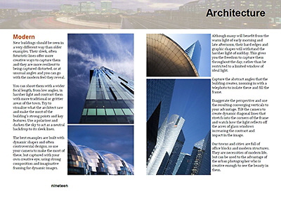 This book reveals how to make the most of these exciting subjects. How to time your shots around the best times of the day. How to spot those abstract views. How to create dynamic images full of colour and movement. And how to include people in your shots in creative ways.